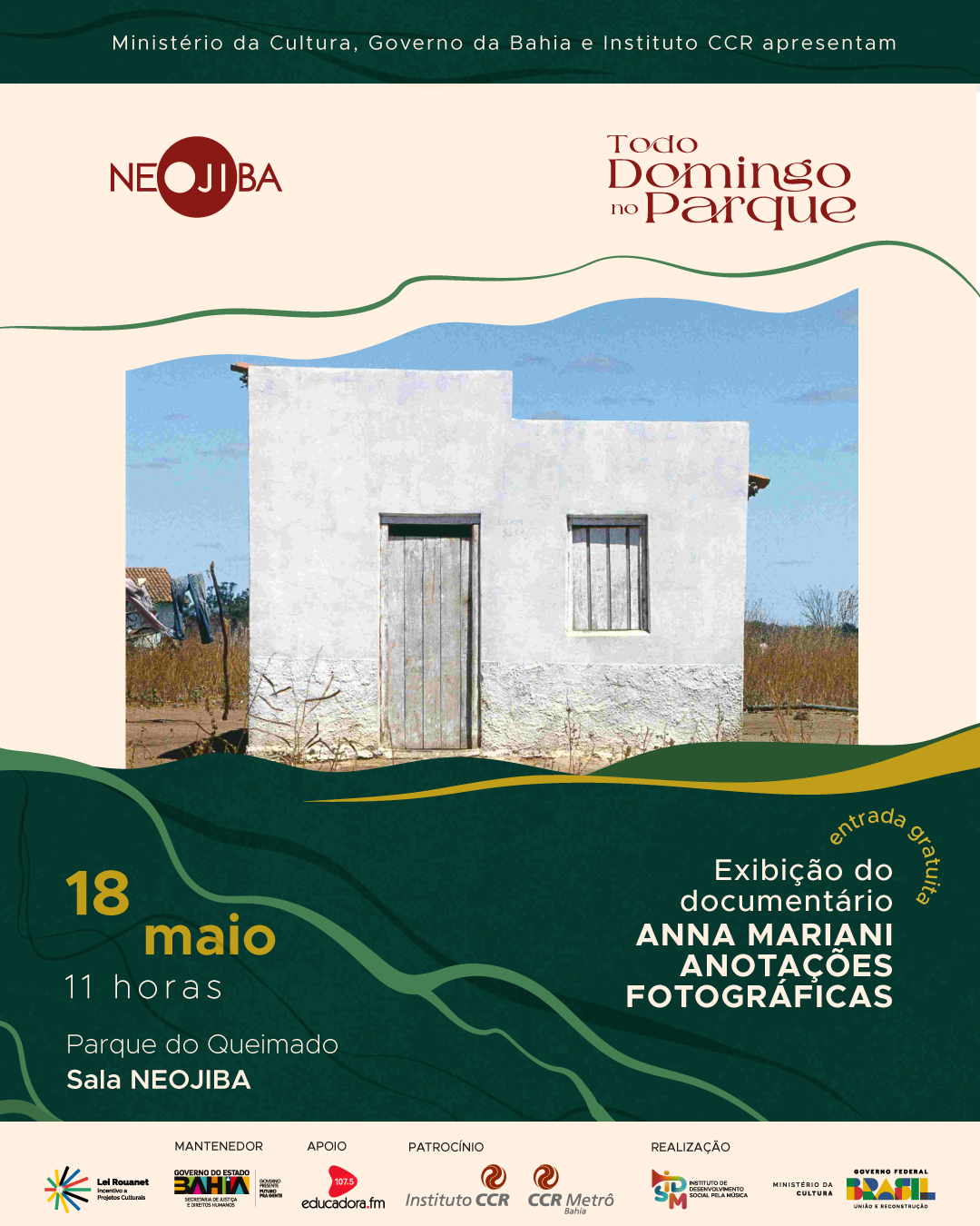 Às 11h, no Parque do Queimado (Liberdade), teremos uma programação diferente: a música dará lugar ao cinema, com a exibição do longa Anna Mariani: Anotações Fotográficas. A obra é dirigida por Alberto Renault e conta com narração de Regina Casé, e textos de Caetano Veloso, Lina Bo Bardi e Ariano Suassuna.