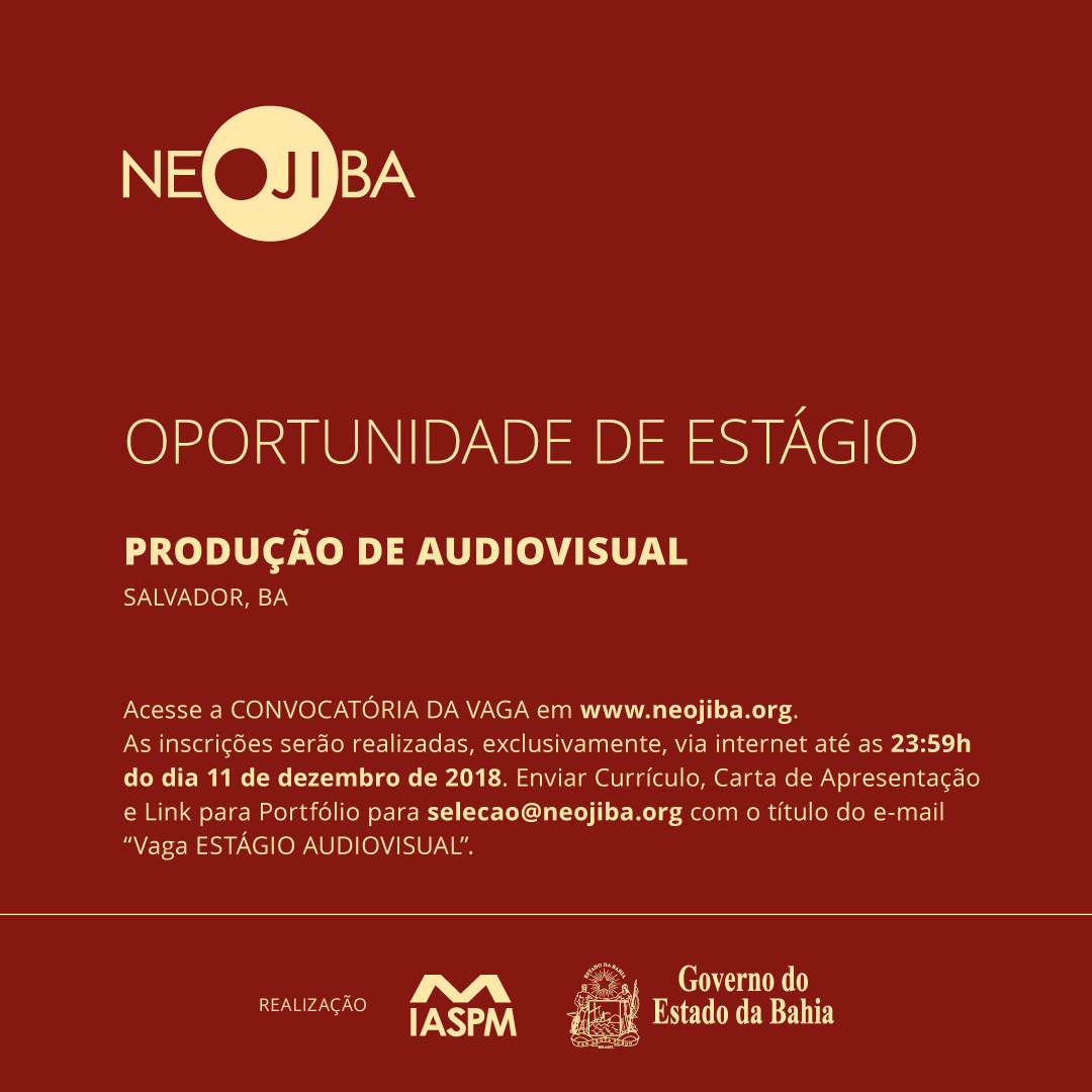O IASPM (Instituto de Ação Social pela Música), organização social responsável pela execução do NEOJIBA, está com processo seletivo aberto para contratação de 01 Estagiário para atuar na área de Comunicação do programa em Salvador.  O NEOJIBA (Núcleos Estaduais de Orquestras Juvenis e Infantis da Bahia) foi criado em 2007 como um dos programas prioritários do Governo do Estado. Tem como missão promover na Bahia o desenvolvimento e a integração social, prioritariamente de crianças, adolescentes e jovens em situações de vulnerabilidade, por meio do ensino e da prática musical coletivos.