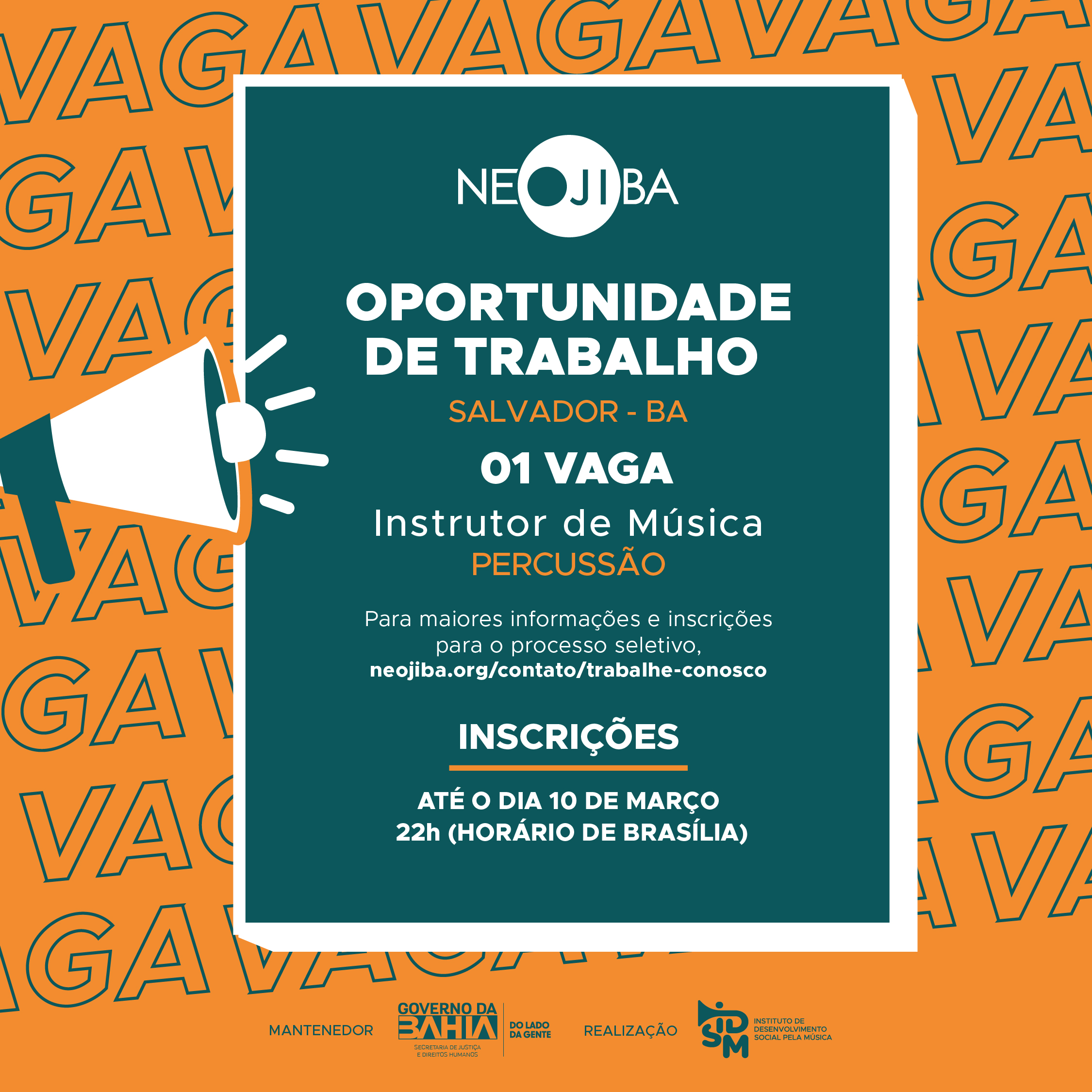 O Instituto de Desenvolvimento Social pela Música (IDSM), Organização Social que faz a gestão do PROGRAMA NEOJIBA (Núcleos Estaduais Juvenis e Infantis da Bahia), no uso de suas atribuições legais, torna pública a realização do Processo Seletivo Simplificado para contratação de pessoal, em regime CLT, para o cargo de INSTRUTOR DE MÚSICA PARA PERCUSSÃO.