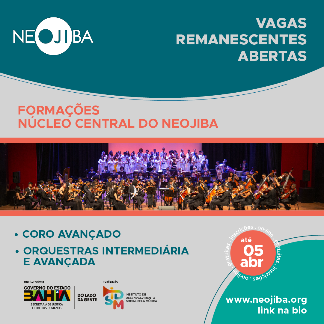 Estão abertas as vagas remanescentes das orquestras avançada e intermediária do NEOJIBA e do coro avançado do NEOJIBA. Leia atentamente o regulamento e faça sua inscrição até 05 de abril de 2026 (Link de inscrição dentro do regulamento). As peças para estudo e regulamento estão abaixo.