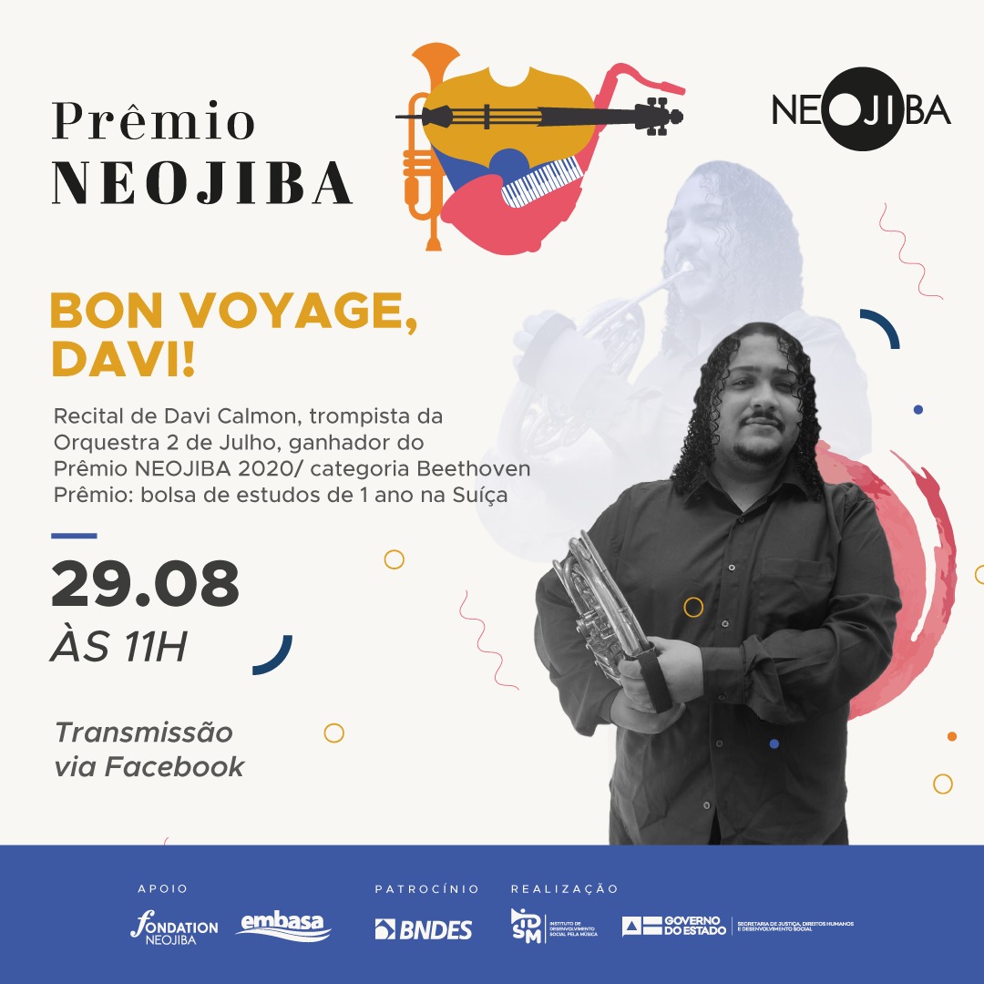 Vencedor da categoria Beethoven, a categoria principal do Prêmio NEOJIBA, Davi ganhou uma bolsa de estudos de um ano de intercâmbio em Genebra, na Suíça, com todas as despesas pagas.