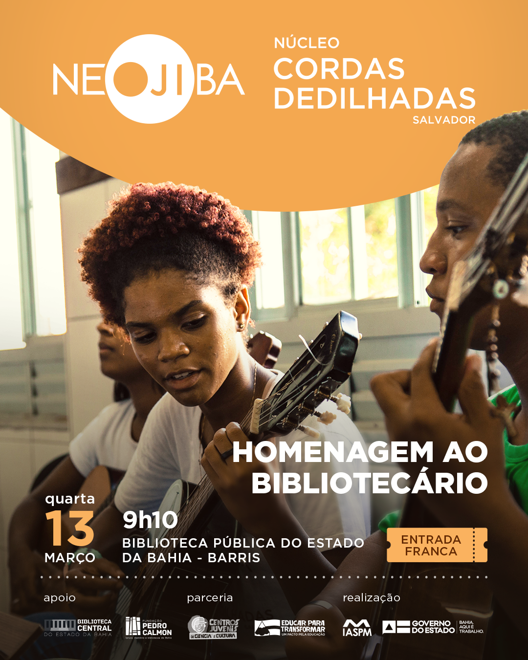 O Núcleo Cordas Dedilhadas vai comemorar o dia do bibliotecário com uma apresentação pública na Biblioteca Pública do Estado da Bahia, nos Barris, às 9h10. Repertório: Somewhere Over the Rainboww (trio de Dedilhadas), O leãozinho, Trenzinho Caipira, Yellow Sumarine e Fui no Itororó. Entrada franca.