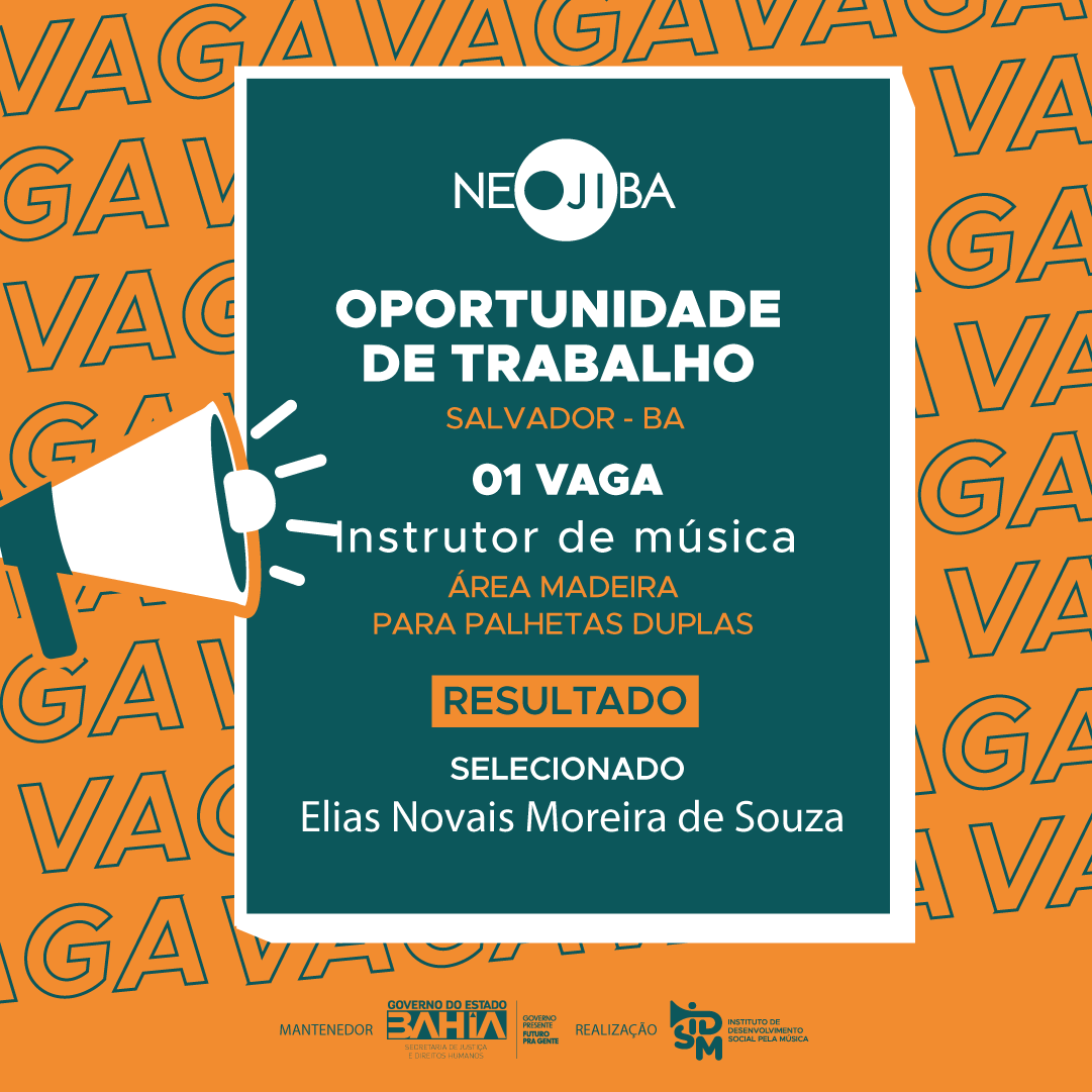 O Instituto de Desenvolvimento Social pela Música (IDSM), Organização Social que faz a gestão do PROGRAMA NEOJIBA (Núcleos Estaduais Juvenis e Infantis da Bahia), no uso de suas atribuições legais, torna pública a realização do Processo Seletivo Simplificado para contratação de pessoal, em regime CLT, para o cargo de INSTRUTOR DE MÚSICA área Madeiras para palhetas duplas.