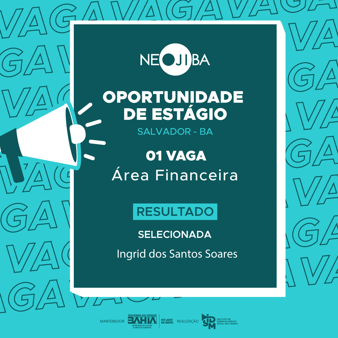 O Instituto de Desenvolvimento Social pela Música (IDSM), Organização Social que faz a gestão do PROGRAMA NEOJIBA (Núcleos Estaduais Juvenis e Infantis da Bahia), no uso de suas atribuições legais, torna pública a realização do Processo Seletivo Simplificado para contratação de 01 estagiário para atuar no setor Financeiro do programa, em Salvador.