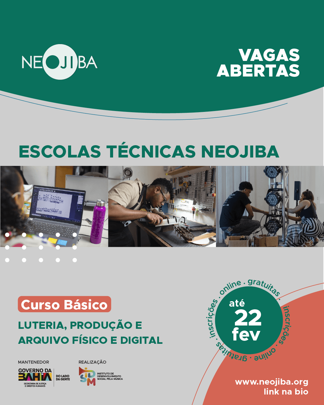 O Instituto de Desenvolvimento Social pela Música (IDSM) está com inscrições abertas para 6 vagas no Programa de Capacitação em Áreas Técnicas no NEOJIBA – ARTS (Curso Básico), nas Escolas de Luteria, Produção de Eventos e Arquivo Físico e Digital.